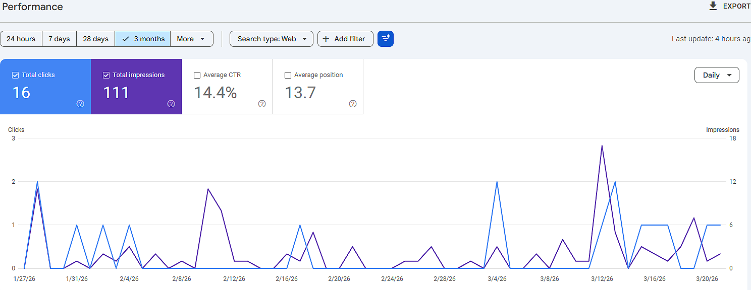 Generated 101 organic impressions and 14 organic clicks on a brand new domain with no previous web presence